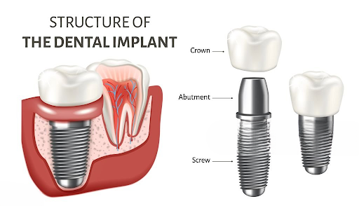 1.The implant - A screw-like structure that is surgically placed into the jawbone & acts like the root of the tooth2.The abutment - A piece that provides connection between the implant and the crown